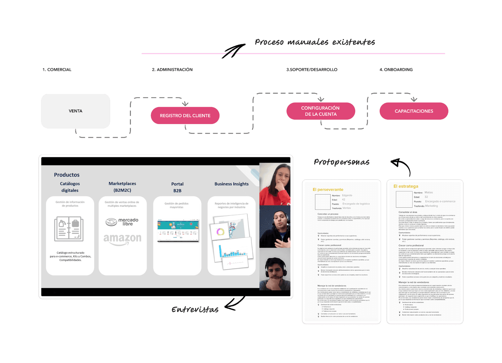 A partir de este objetivo, nos preguntamos cómo era la experiencia real de alta y primer uso de la plataforma. El análisis evidenció un onboarding manual, poco escalable y sin guías claras para el usuario. Para comprender el problema en profundidad, realizamos un mapeo del flujo end‑to‑end, entrevistas con distintos perfiles de usuarios y un análisis de mercado de plataformas SaaS con onboarding autoasistido, junto con la revisión de métricas internas de activación y soporte.