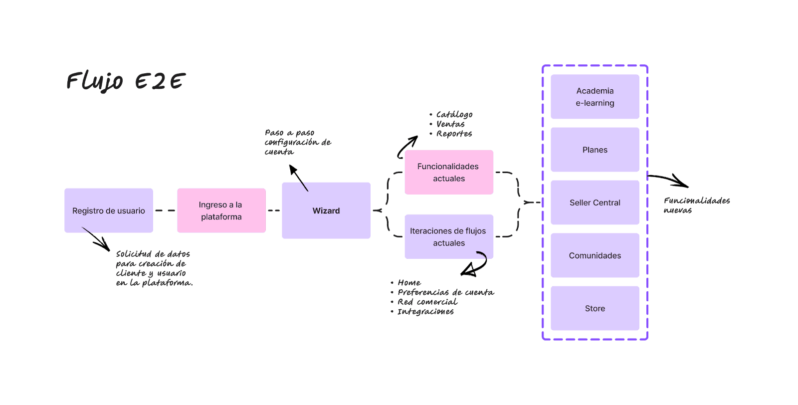 Para que la experiencia fuera consistente y escalable, era necesario repensar el flujo end-to-end y alinear las distintas secciones de la plataforma al nuevo modelo de autogestión. El onboarding debía funcionar como puerta de entrada al ecosistema, acompañando a cada Seller desde la creación de su cuenta hasta gestión de su operación.
