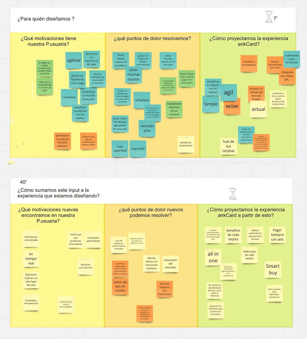Para redefinir la propuesta de valor de ankCard, organizamos un taller de ideación interdisciplinario con los equipos de Producto, UX, Desarrollo y Marketing.
