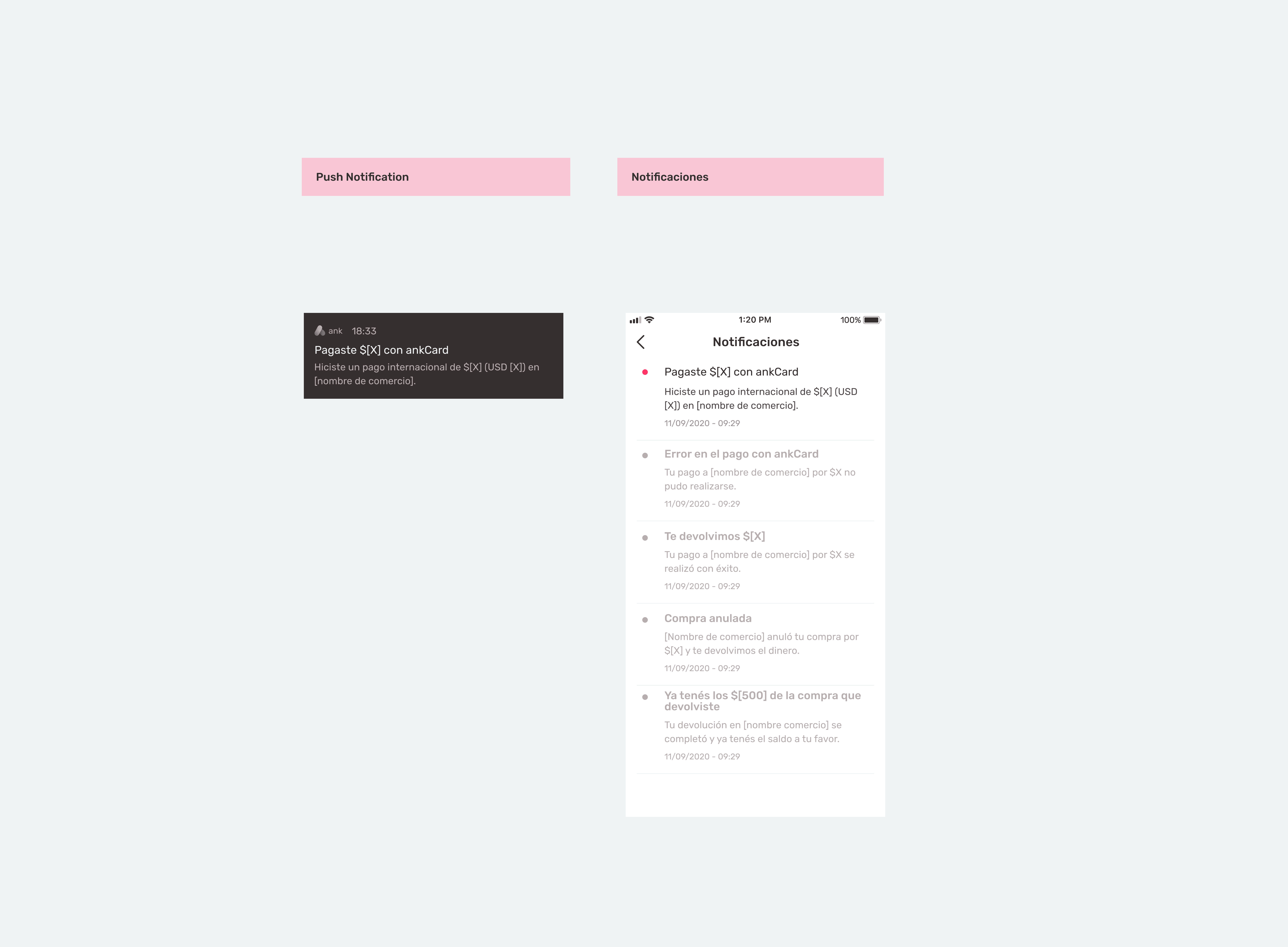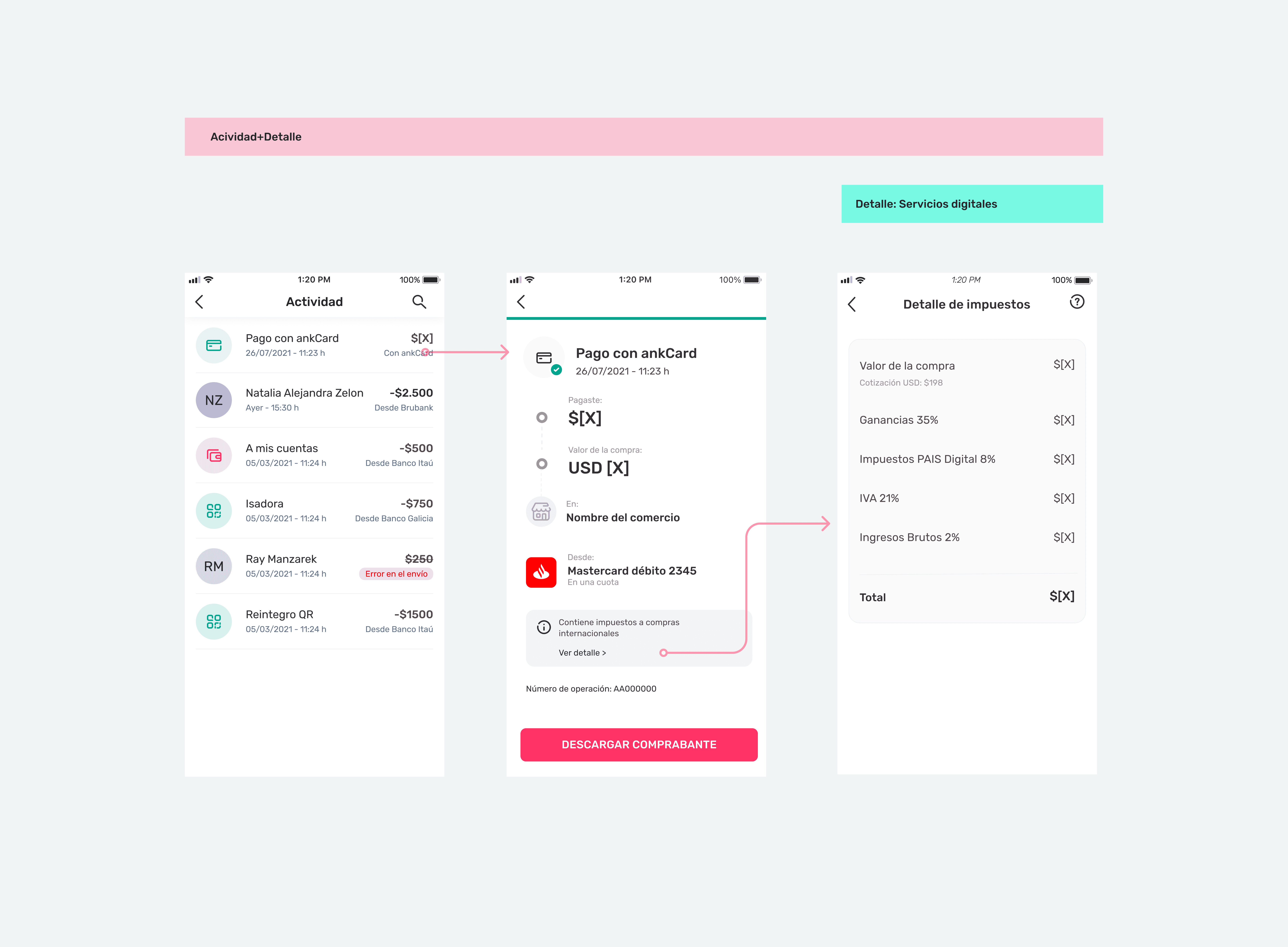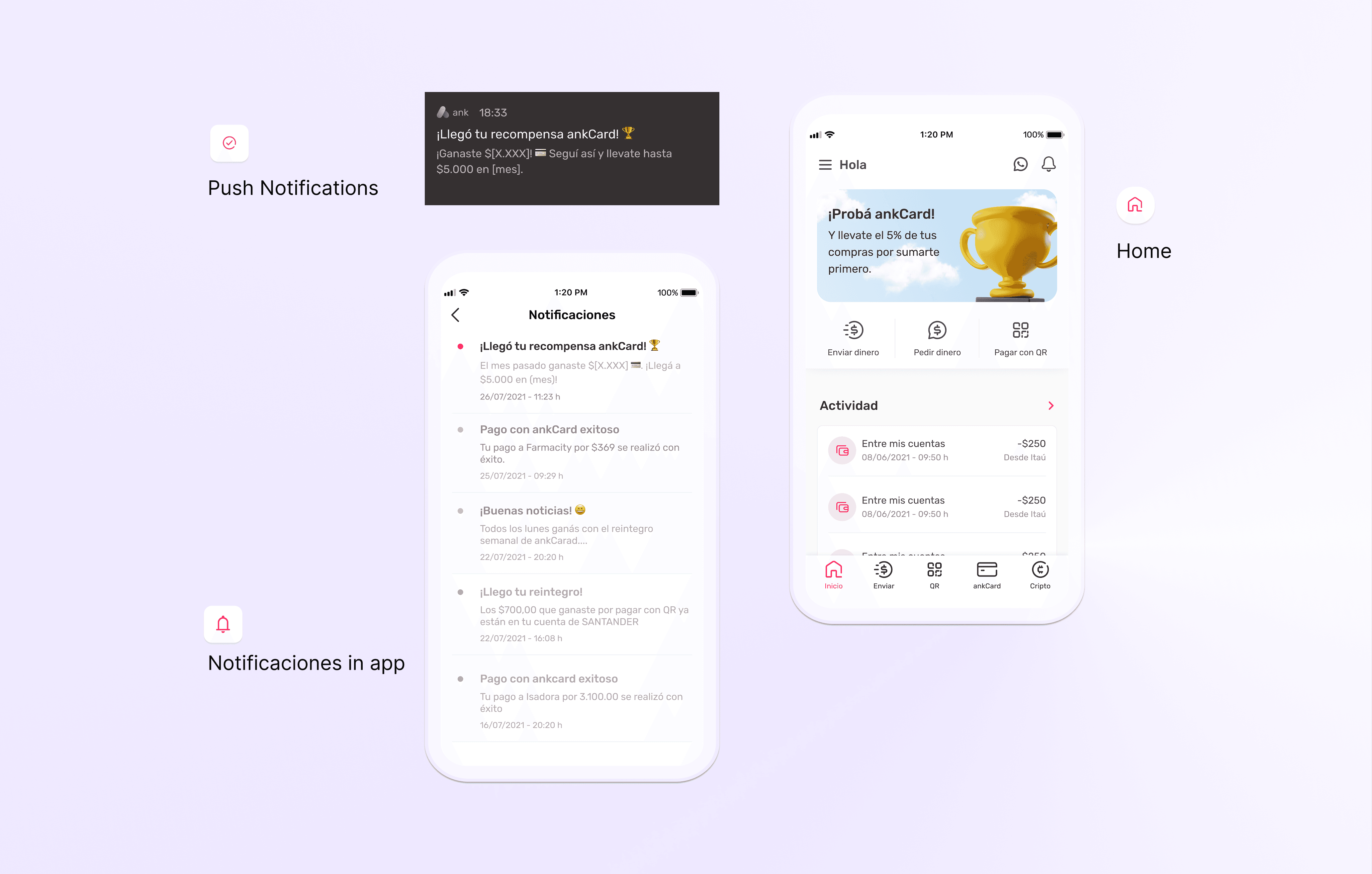 Notificaciones push y detalle de actividad según tipo de transacción.
